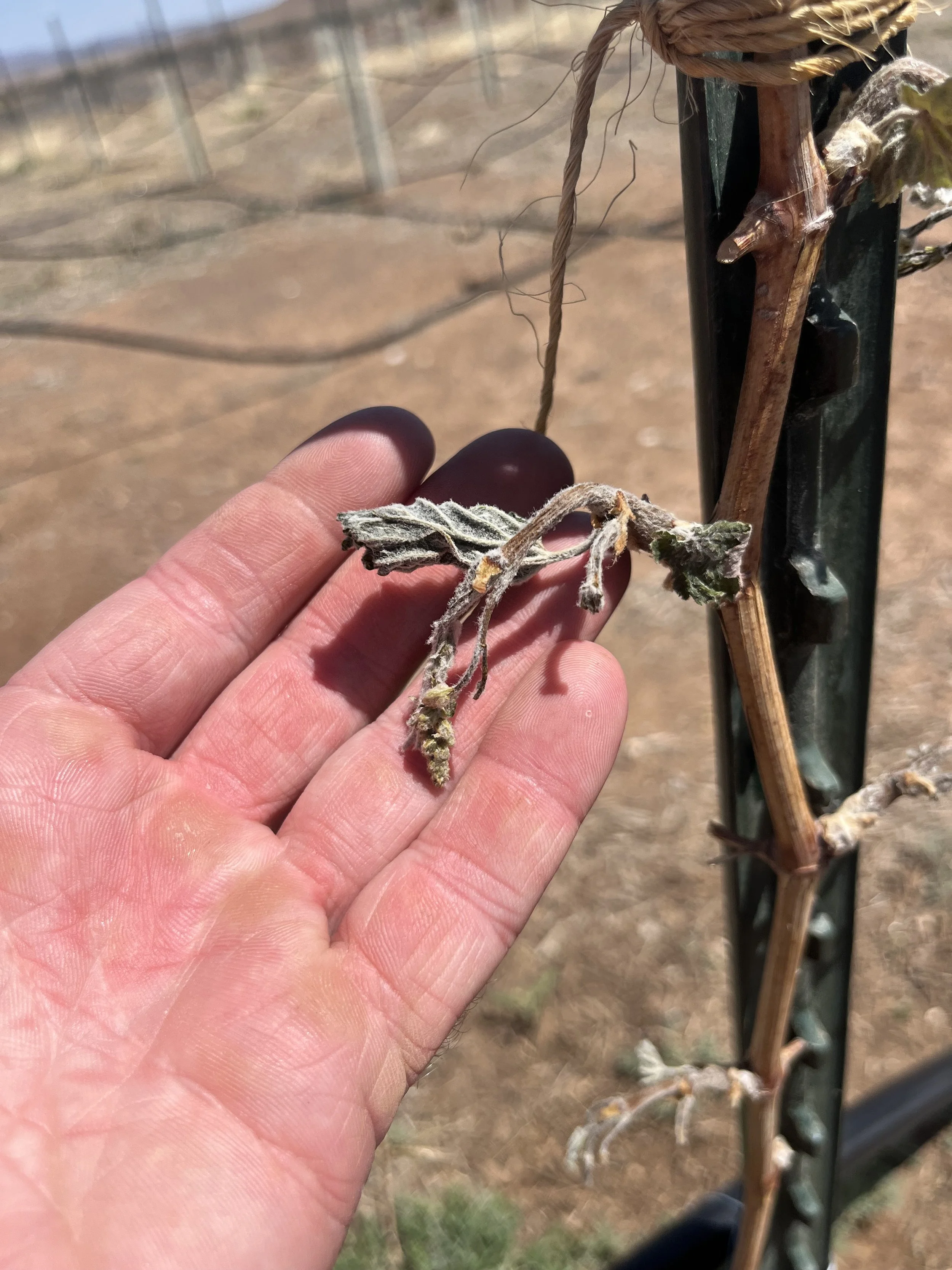 We received about 6 inches of snow on April 4th, the snow, along with driving winds complete froze the tender shoots that were starting to emerge at both our Grand Prix Vineyard, and Mountain Shadows.